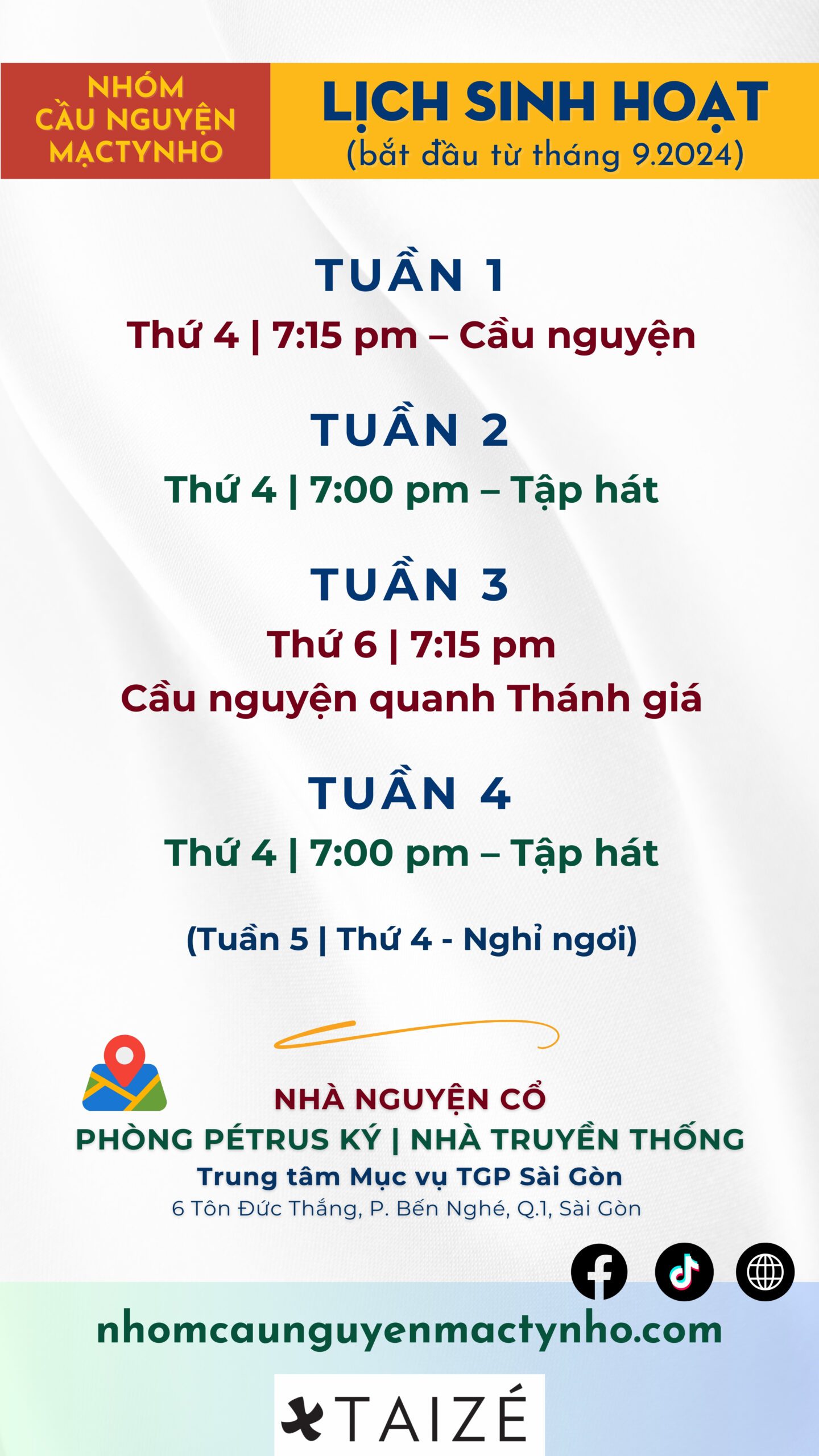 *Lịch có thể thay đổi, xin vui lòng theo dõi trang Facebook Nhóm Cầu Nguyện Mạctynho – Taizé Vietnam